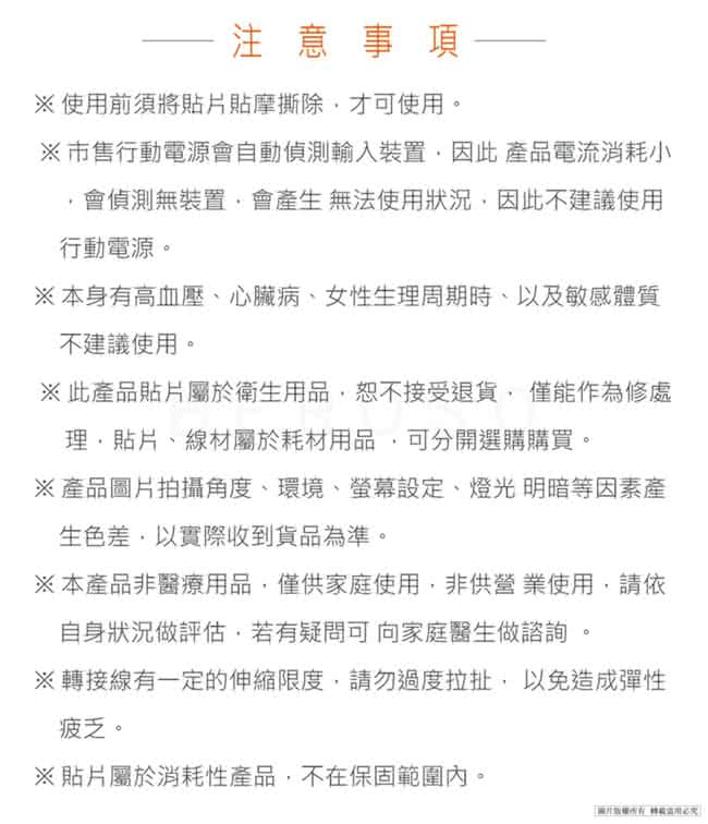 ※ 此產品貼片屬於衛生用品,恕不接受退貨,僅能作為修處理,貼片、線材屬於耗材用品,可分開選購購買。